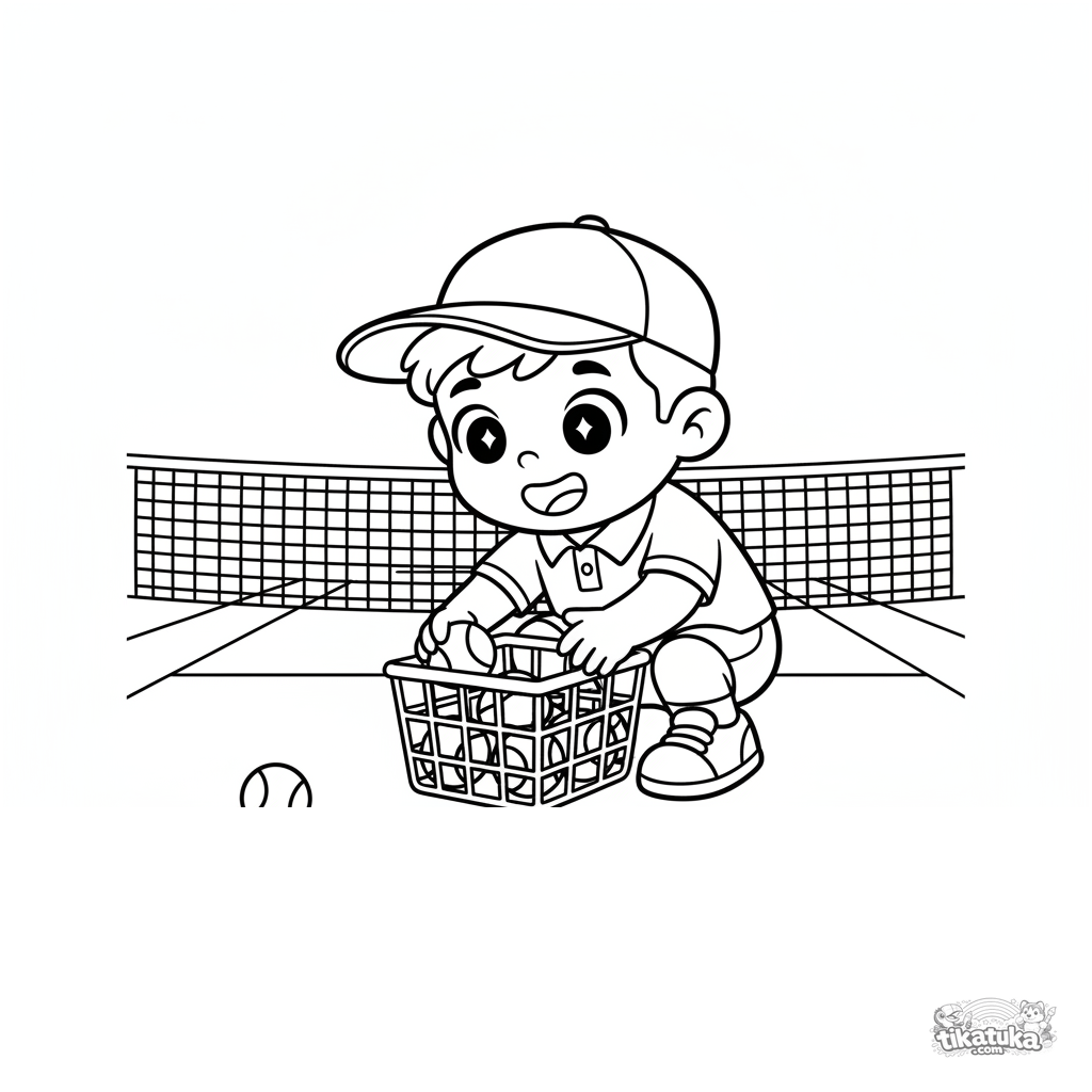 Ausmalbild für Kinder 4-6 Jahre: ein junger Helfer auf einem Tennisplatz sammelt Bälle. Eine lustige und verständliche Szene über eine wichtige Sportrolle.