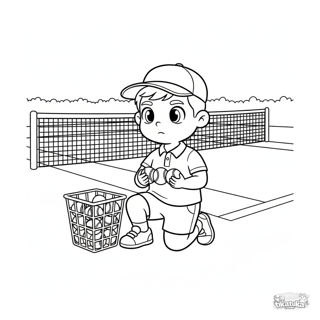 Ausmalbild für Kinder 4-6 Jahre: ein junger Helfer auf dem Tennisplatz — ein Balljunge bereit, Bälle zu liefern. Szene mit Korb, Bällen und Netz.
