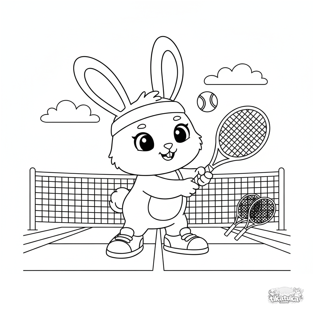 Ausmalbild für Kinder 4-6 Jahre: ein süßer Hase bereitet den Aufschlag auf einem Tennisplatz vor. Lebendige Szene mit Netz und klaren Umrissen.
