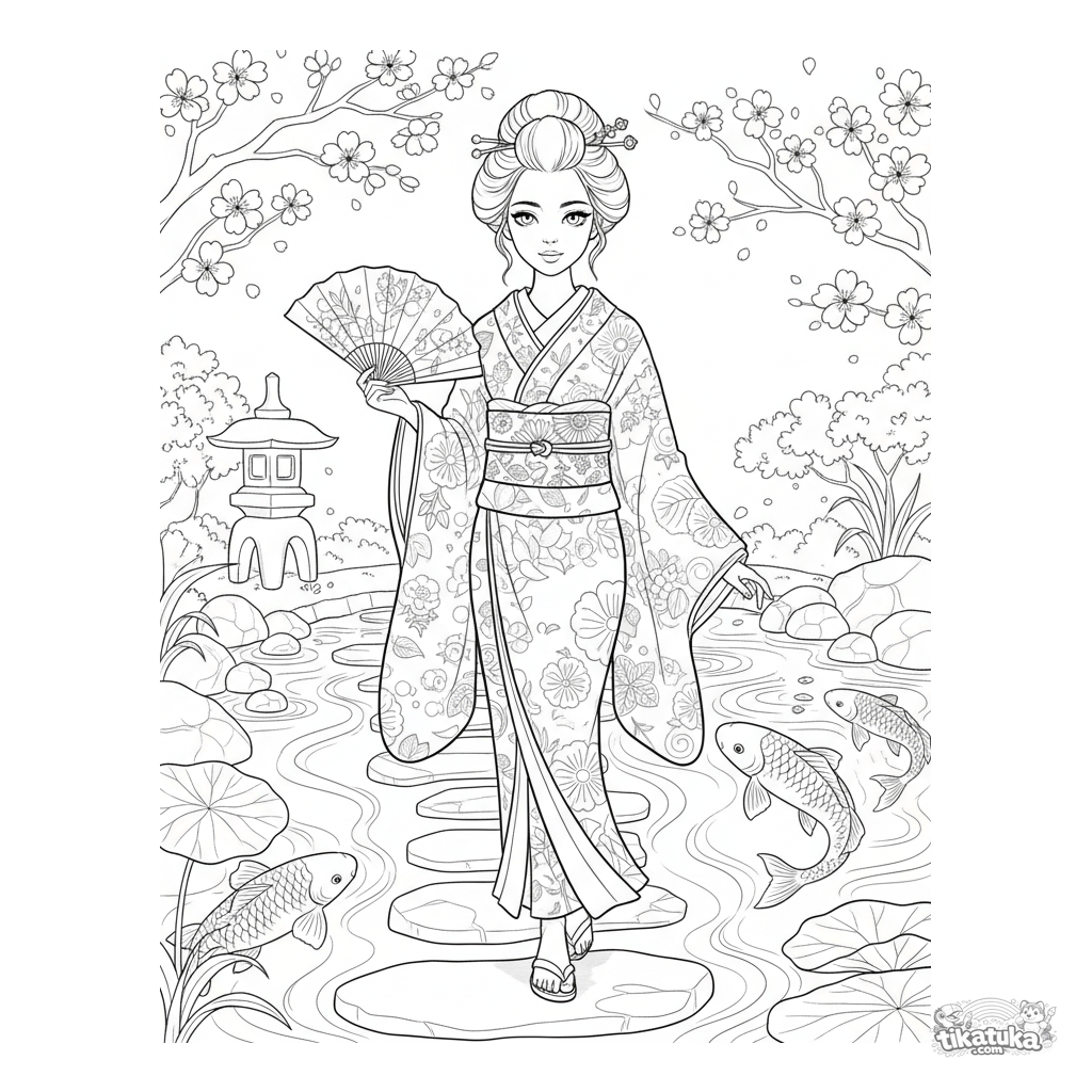 Realistisches Ausmalbild für 10-12 Jahre: Ein Mädchen im Kimono-inspirierten Gewand geht durch einen detaillierten Japanischen Garten mit Laternen, Kirschblüten und Teich.