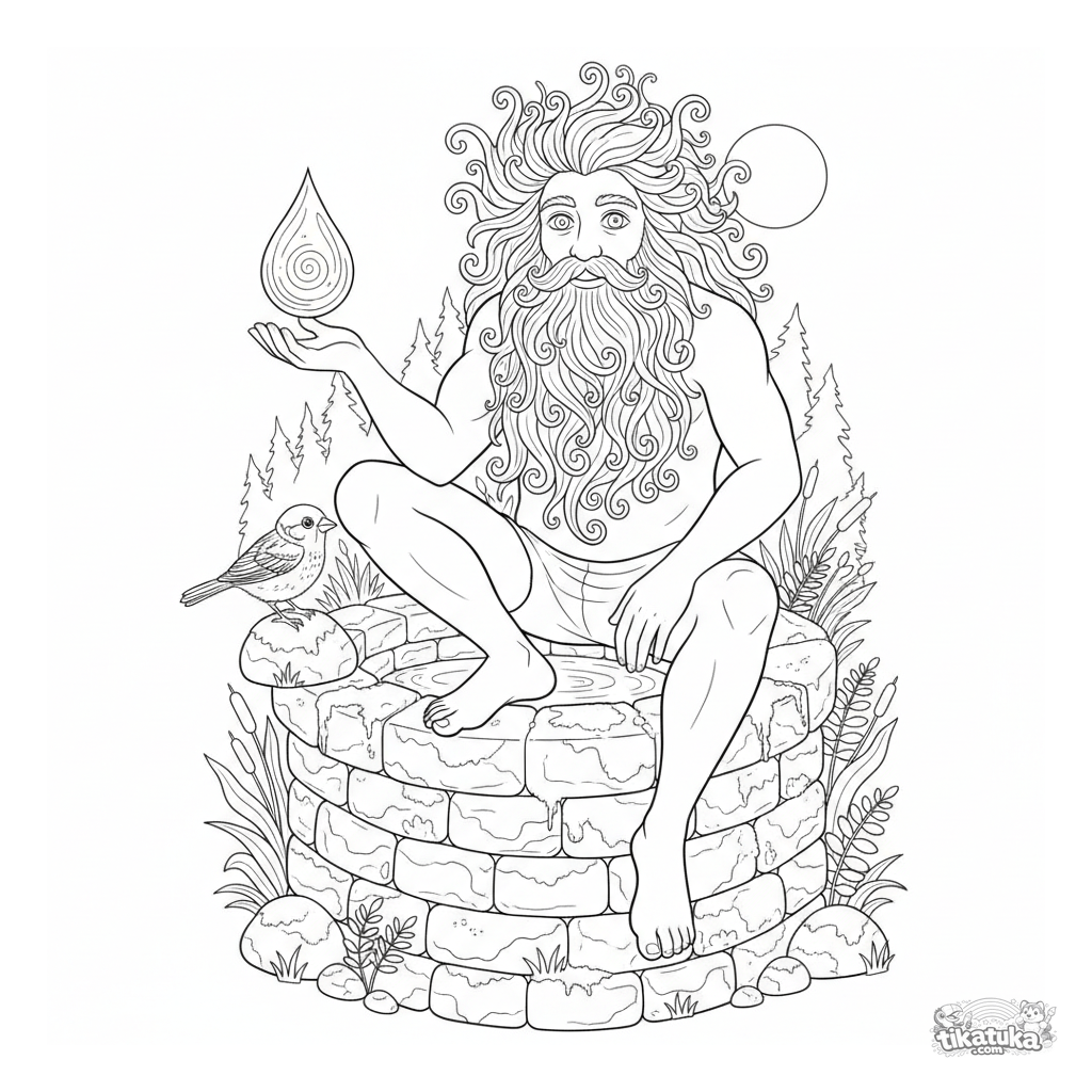Detailliertes Ausmalbild 10-12: Ein freundlicher Wassergeist, Wächter des Brunnens mit lebendigem Wasser. Aufwändige Feldskizzen-Illustration für Folklore-Fans.