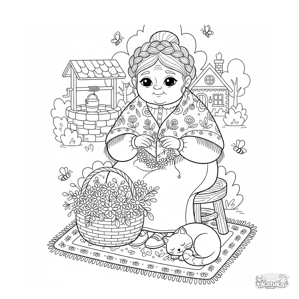 Ausmalbild für Kinder 4-6: Eine gütige Großmutter im Schal flicht einen Blumenkranz am Brunnen. Szene im Volksstickerei-Stil mit Blumenkorb und Katze.