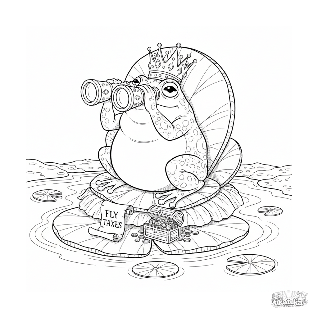 Ausmalbild für Kinder 10-12: Ein Froschkönig auf einem Seerosenblatt-Thron benutzt ein juwelenbesetztes Fernglas, um die Teichufer nach Tribut abzusuchen. Detaillierte humorvolle Szene.