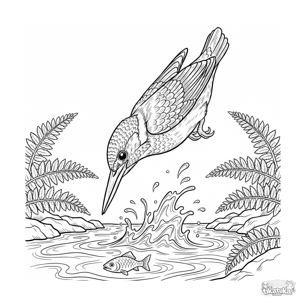 Komplexes Ausmalbild für 10-12 Jahre: Ein Eisvogel im Moment des Tauchens in einen schnellen, klaren Bach nach einem Fisch. Dynamische Szene im Vintage-Gravurstil.