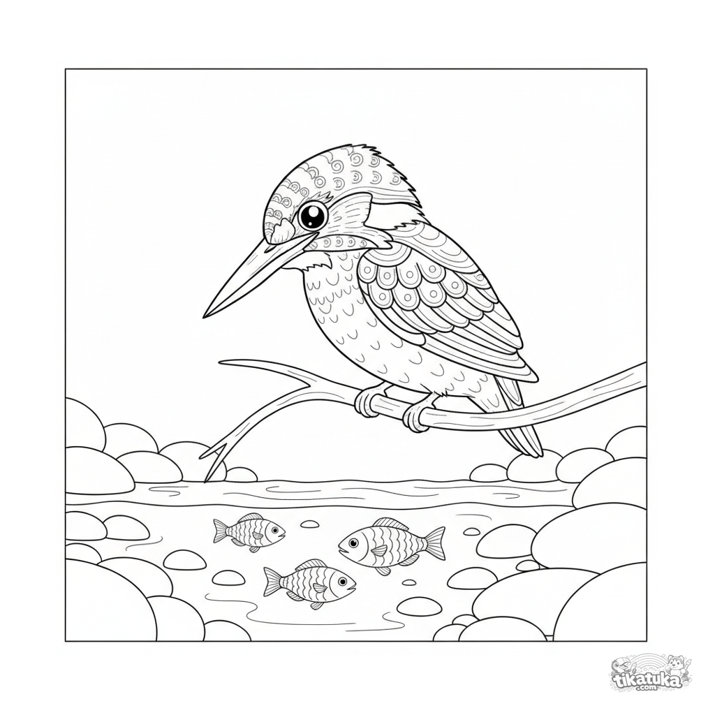 Detailliertes Ausmalbild für Kinder 10-12: Ein Eisvogel auf einem Ast über einem klaren Bach, auf Beute wartend. Realistische Vogelillustration mit Details.