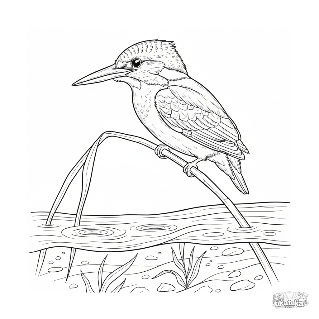 Detailliertes Ausmalbild für Kinder 10-12: ein Eisvogel in natürlicher Pose auf einem Schilfrohr am Bach. Realistischer Feldführer-Stil.
