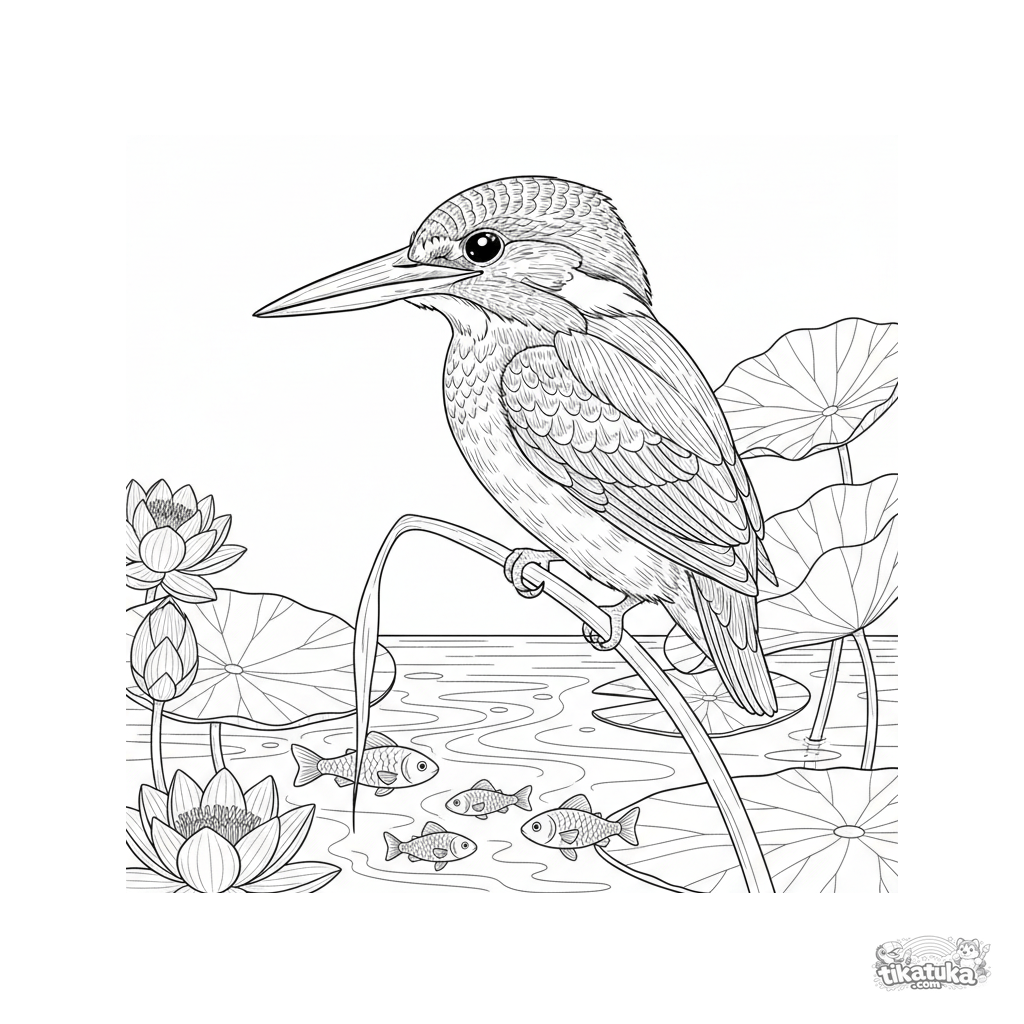 Detailliertes Ausmalbild für Kinder 10-12: Ein Eisvogel auf einem Schilfrohr über einem Bach, auf Beute wartend. Realistische Umrisse, Federn, Wasserpflanzen.