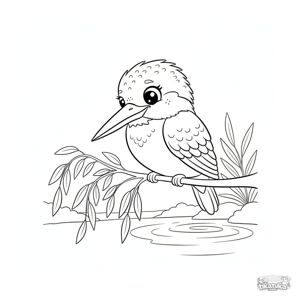 Ausmalbild für Kinder von 4-6 Jahren: ein lebhafter Eisvogel sitzt auf einem schlanken Weidenast über einem klaren Bach und beobachtet aufmerksam.
