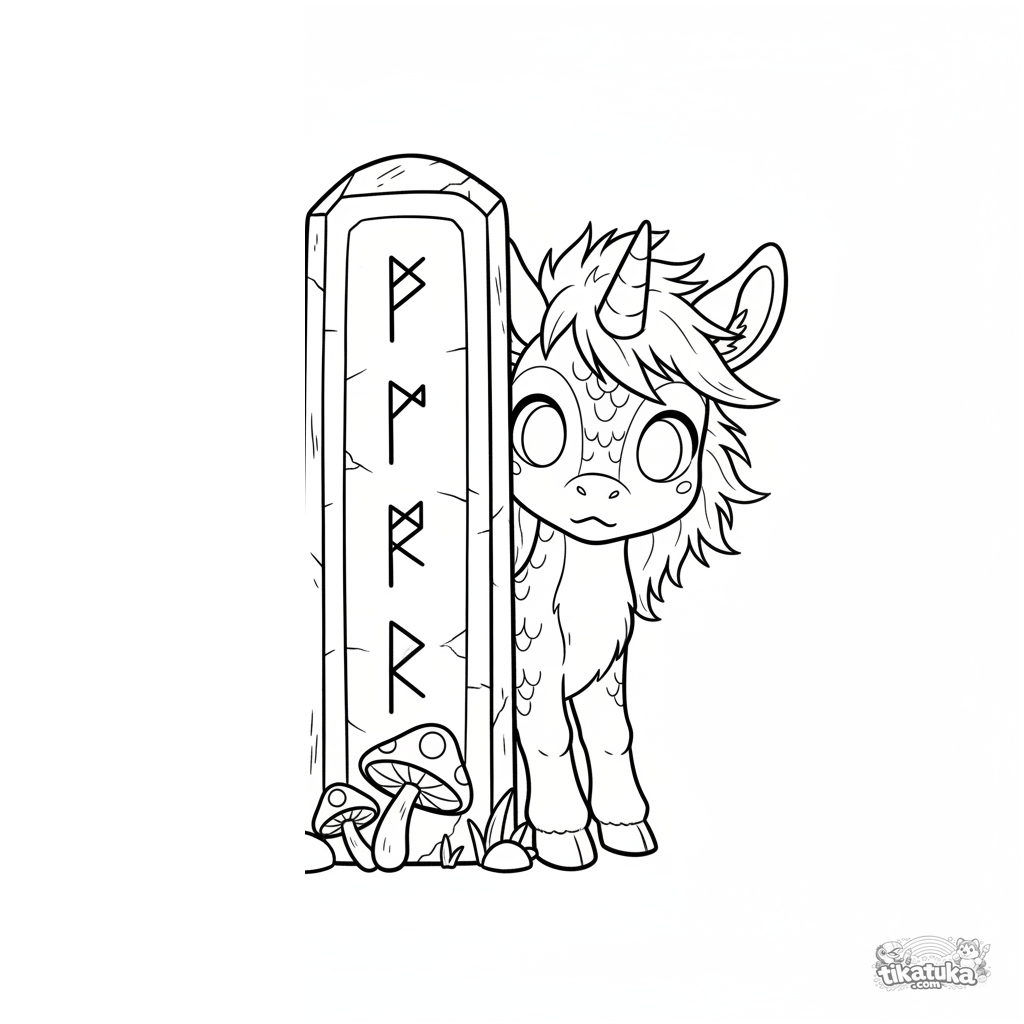 Ausmalbild für Kinder von 4-6 Jahren: ein scheues Kirin-Fohlen lugt hinter einem alten, runenbedeckten Stein hervor. Ausdrucksstarke Augen, einfache Szene, perfekt zur Entwicklung der Feinmotorik.