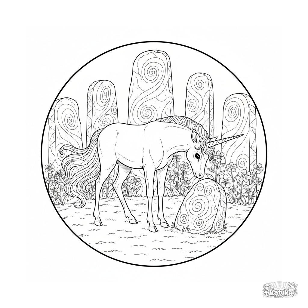 Ausmalbild für ältere Kinder 10-12: Ein edles Kirin steht in einem Kreis alter Monolithen und stupst sanft einen gefallenen Runenstein. Detaillierte Linien, naturalistischer Stil.