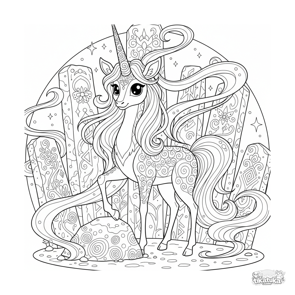 Detailliertes Ausmalbild für ältere Kinder 10-12 Jahre: Ein edler Kirin steht Wache im Zentrum eines uralten Kreises runenbedeckter Monolithen. Reichhaltiges Detail, fließende Linien.
