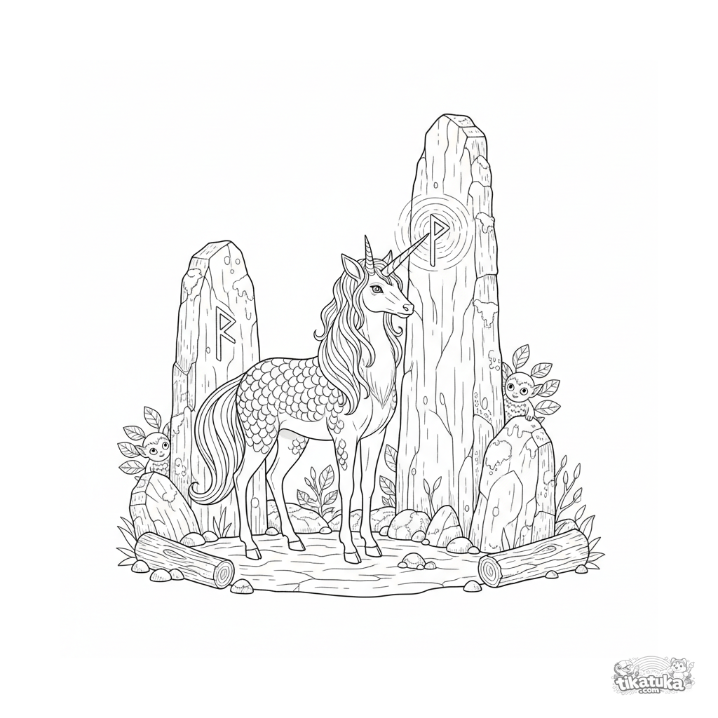 Komplexes Ausmalbild für Kinder von 10-12 Jahren: ein majestätischer Kirin, ein mythisches Wesen, aktiviert Runen auf einem alten Monolithen. Detaillierte Linien, pädagogisches Thema.