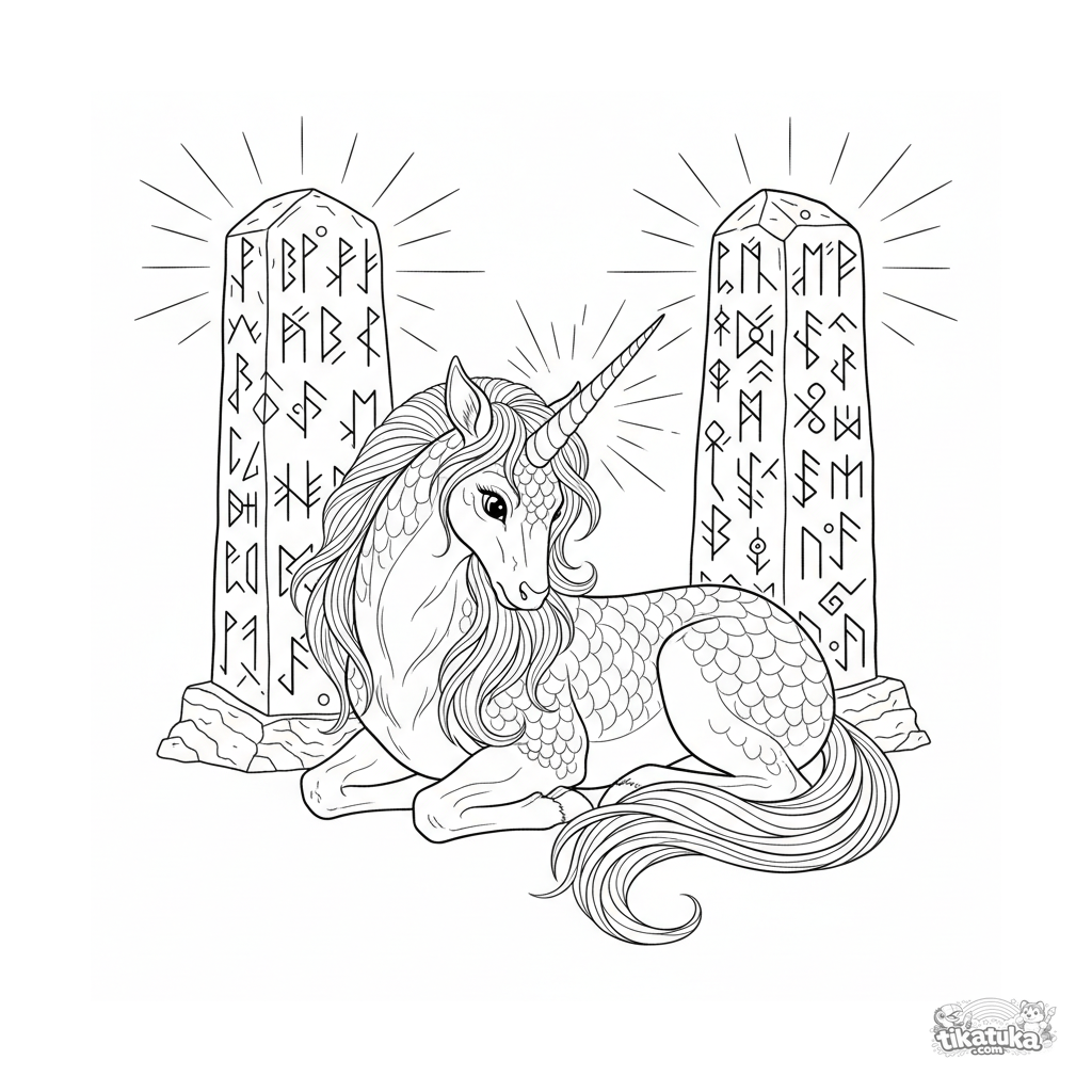 Komplexes Ausmalbild für ältere Kinder 10-12: Ein mythischer Kirin meditiert zwischen uralten Runenmonolithen. Hohes Detaillierungsniveau, Texturen, Hintergrund.