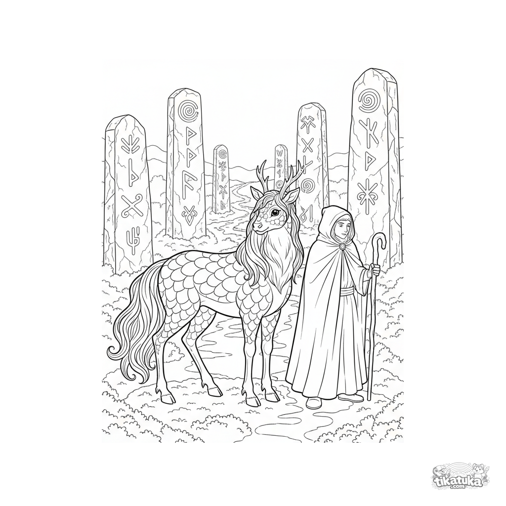 Ausmalbild für Kinder 7-9: Ein weiser, mythischer Kirin führt einen Reisenden durch einen Wald alter Runenmonolithen. Szene mit mäßigem Detail.