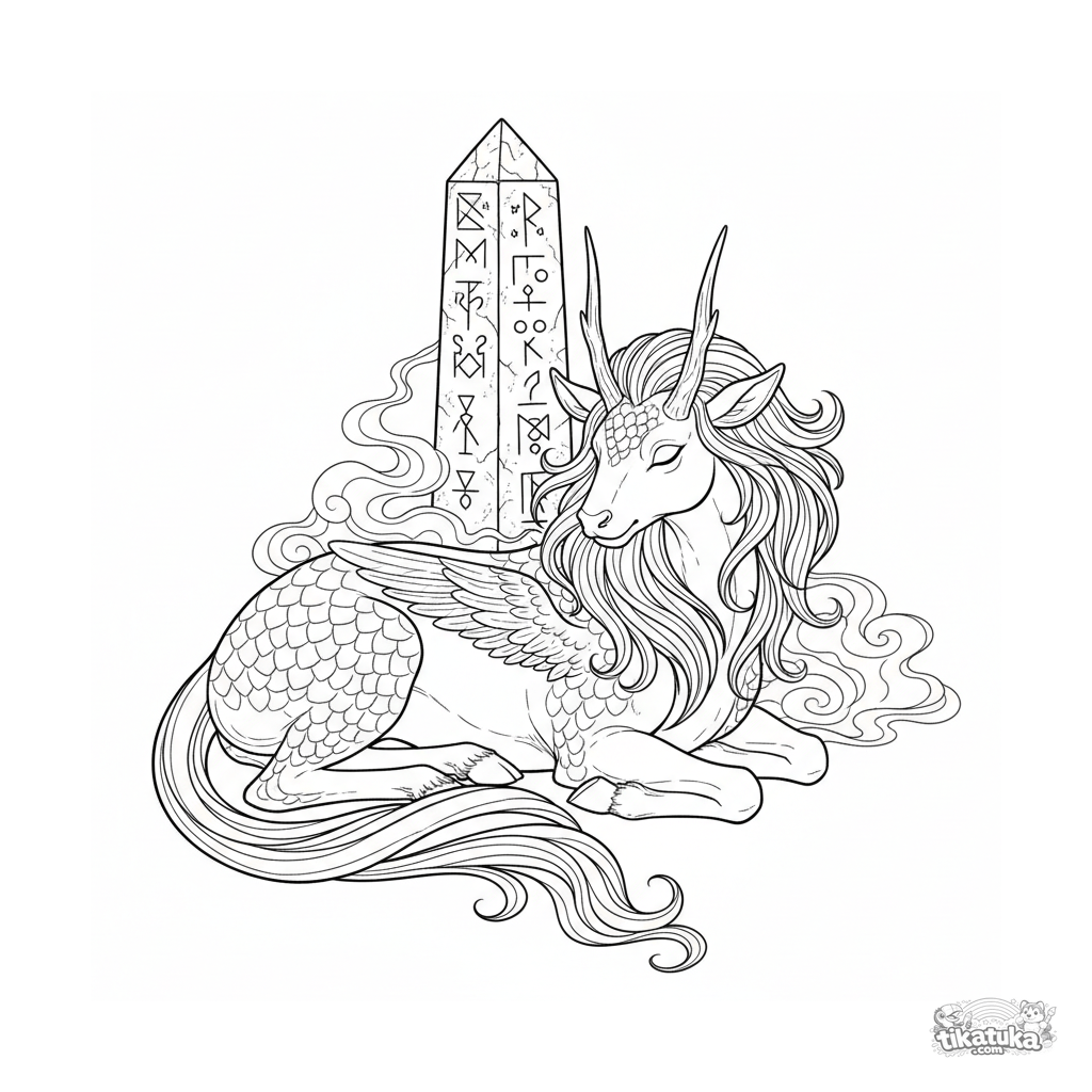 Ausmalbild für 10-12 Jahre: Ein majestätisches Kirin ruht am Fuße eines alten Runenobelisken. Stilisierter Stich, detaillierte Textur, Atmosphäre der Ruhe und Legende.