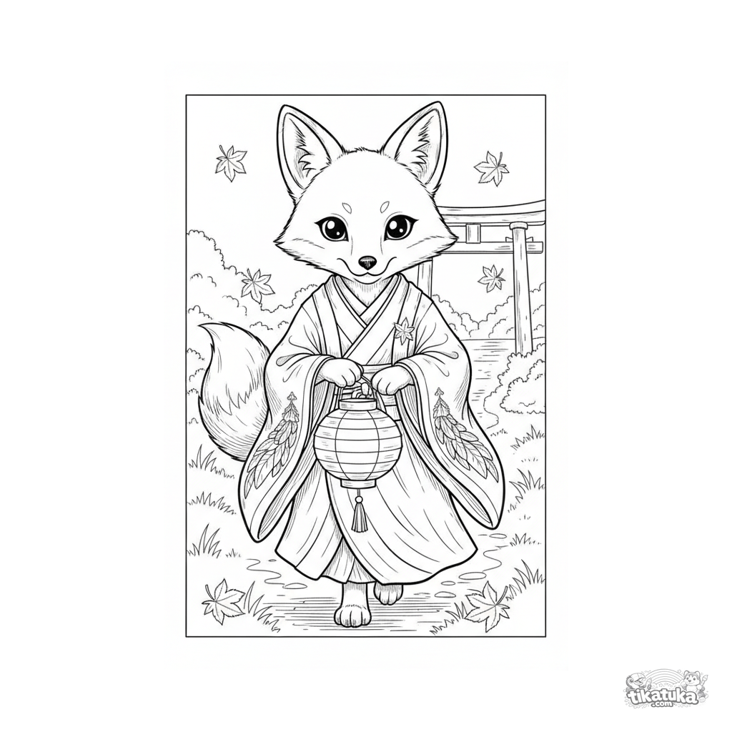 Kinder Ausmalbild: ein Kitsune Fuchsgeist in einem Festgewand trägt eine Papierlaterne einen Waldweg entlang zu einem Torii-Tor.