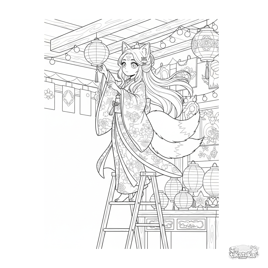Detailliertes Ausmalbild für 10-12 Jahre: ein Kitsune-Mädchen hängt Papierlaternen in einem festlichen Saal auf. Komplexe Umrisse, Kleidungs- und Dekorelemente, volle Figur.