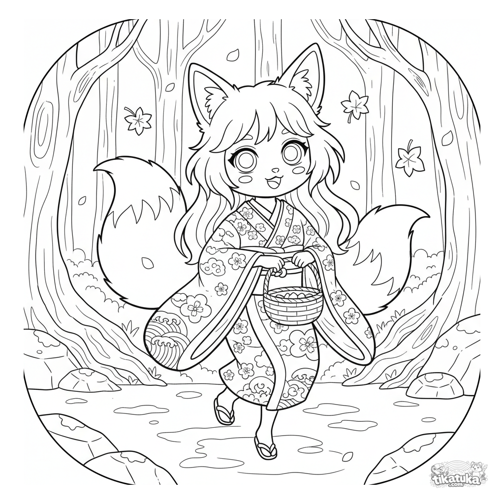 Detailliertes Anime-Ausmalbild für 10-12 Jahre: ein Kitsune-Geist mit zwei Schwänzen im Kimono sammelt verspielt Herbstblätter in einem Korb auf einer magischen Waldlichtung.