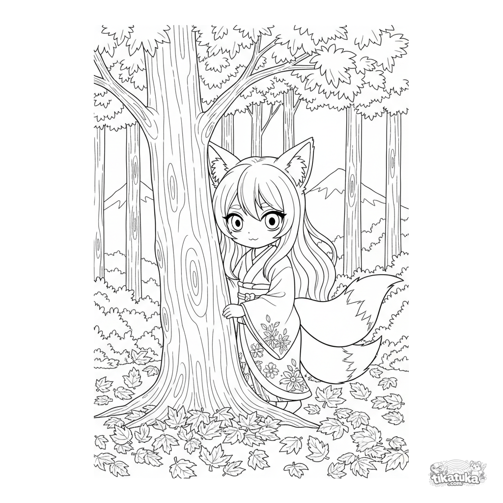 Anime-Ausmalbild: Ein Kitsune-Geistmädchen mit Fuchsohren und -schwanz lugt hinter einem Ahorn im Herbstwald hervor. Für 10-12 Jahre mit detailliertem Hintergrund.