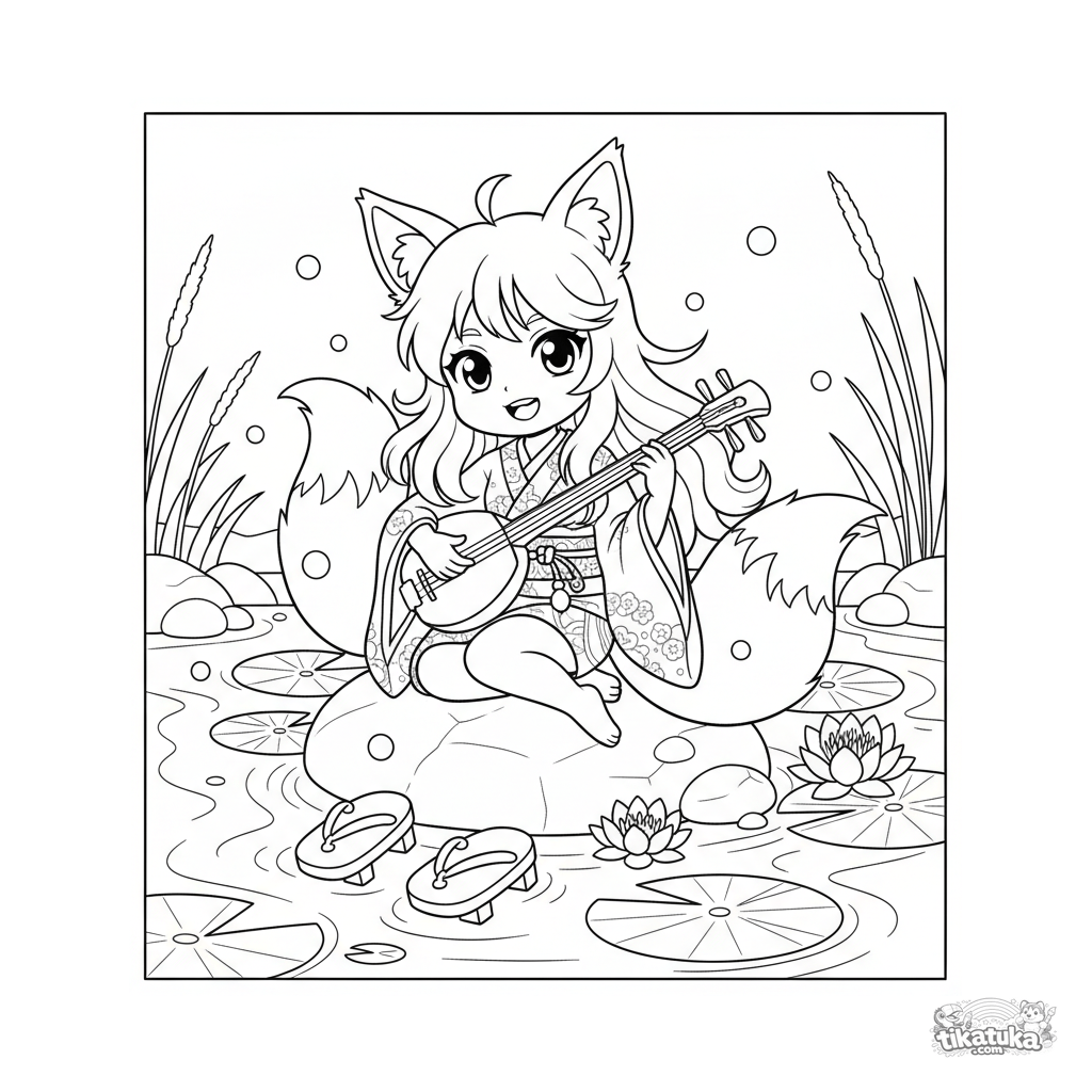 Detailliertes Anime-Ausmalbild: ein Kitsune-Geistmädchen spielt eine traditionelle Shamisen am Flussufer in der Dämmerung, umgeben von Glühwürmchen.