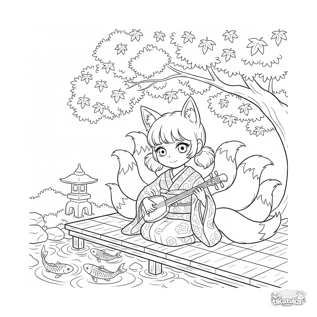 Detaillierte Anime-Malvorlage: Ein Kitsune-Geistmädchen mit flauschigen Schwänzen spielt eine traditionelle Shamisen in einem Herbstgarten. Komplexe Szene mit Hintergrund für Kinder 10-12.