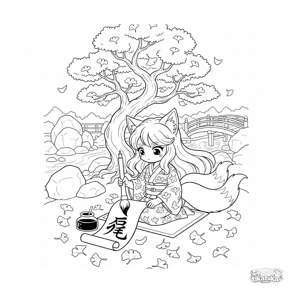 Anime-Stil Ausmalbild: Ein Kitsune-Geist übt Kalligraphie in einem ruhigen Herbsttempelgarten. Detaillierte Szene für Kinder von 10-12 Jahren.