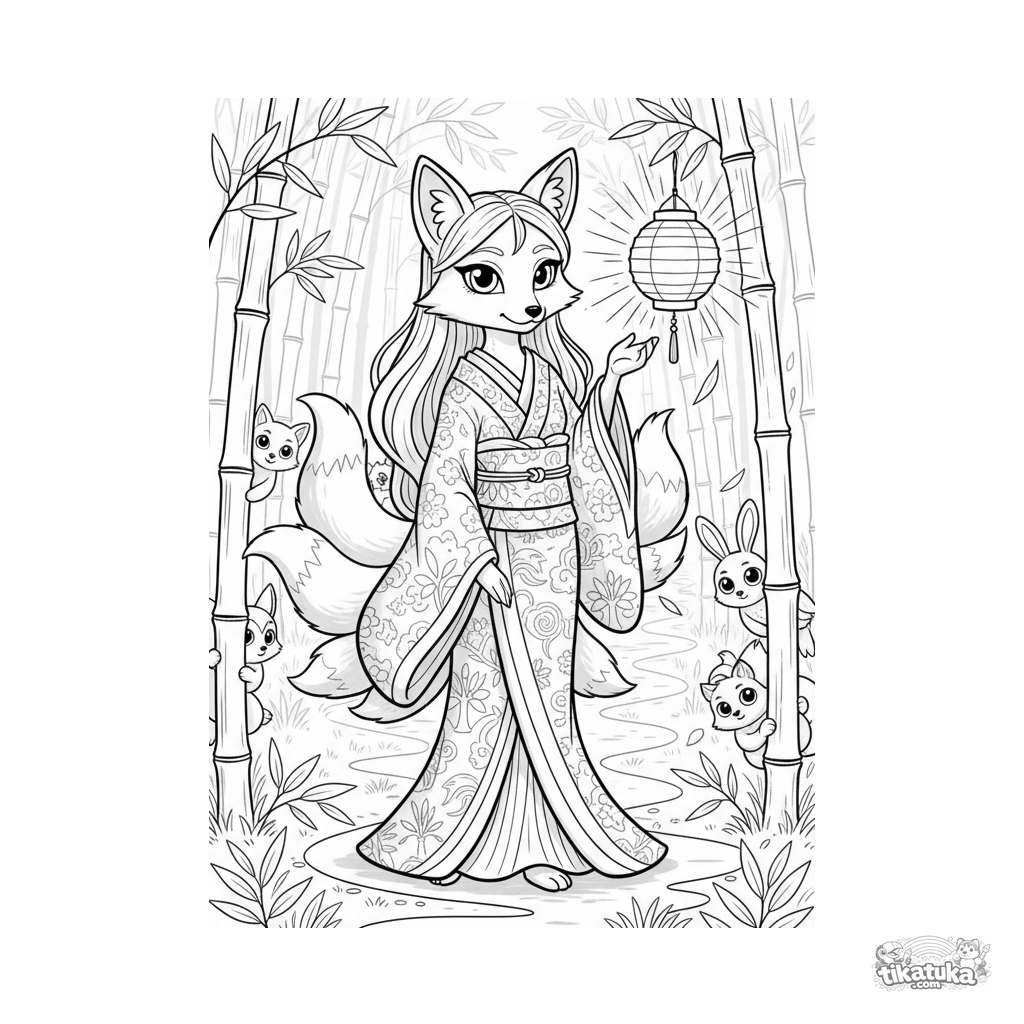 Anime-Ausmalbild: Ein Kitsune-Geist mit Laterne führt durch einen herbstlichen Bambuswald. Detaillierte, atmosphärische Szene für Kinder von 10-12.