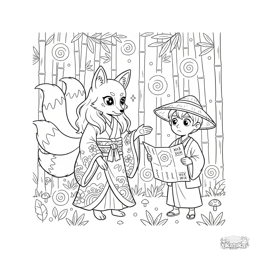 Detailliertes Anime-Ausmalbild für 10-12 Jahre: ein Kitsune-Geist hilft einem verlorenen Reisenden in einem verzauberten Bambuswald. Szene mit zwei Charakteren und mystischem Hintergrund.