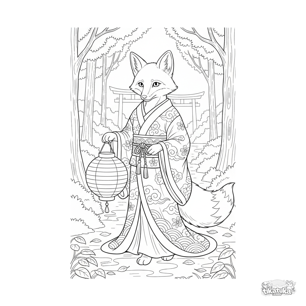 Ausmalbild für ältere Kinder: ein Kitsune-Fuchsgeist in einem Festgewand trägt eine Papierlaterne einen Waldweg entlang. Detaillierte Szene aus der japanischen Folklore.
