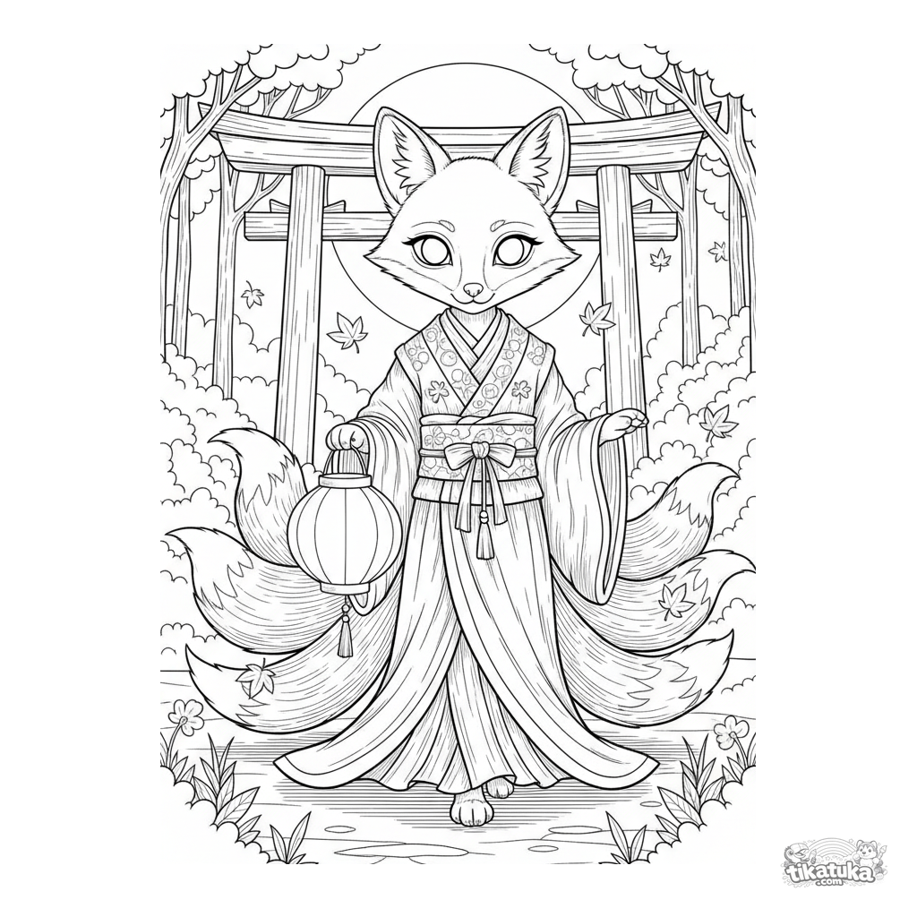 Ausmalbild für ältere Kinder: Ein Kitsune-Fuchsgeist in Gewändern trägt eine Papierlaterne einen Waldpfad entlang. Detaillierte japanische Folklore-Szene mit Ahornblättern.