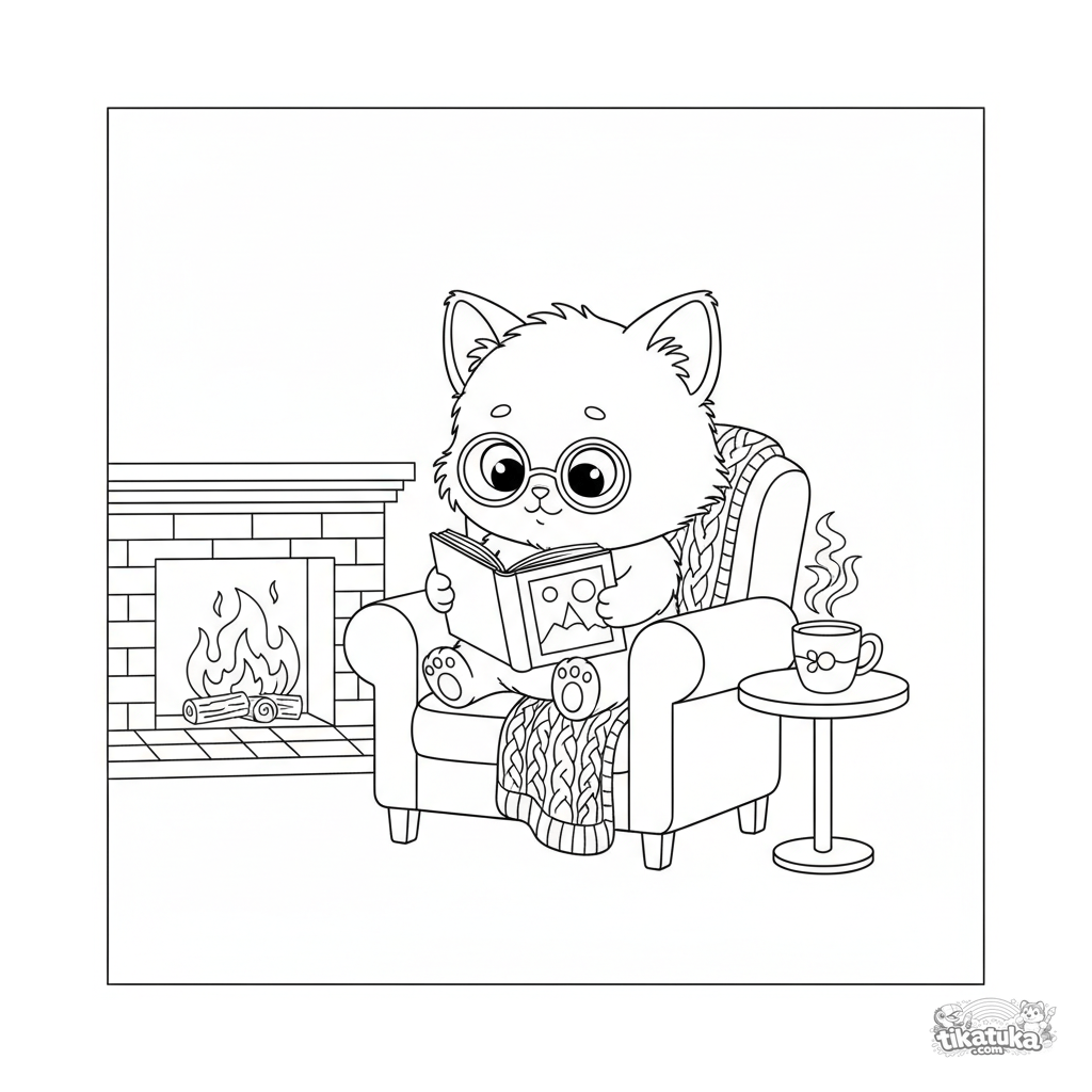 Ausmalbild für Kinder 4-6: Ein entzückendes Kätzchen mit Brille liest ein Buch in einem Plüschsessel am Kamin. Eine Szene voller warmer, gemütlicher Hausdetails.