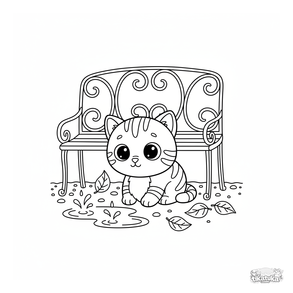 Ausmalbild für Kinder 4-6 Jahre: ein kleines gestreiftes Kätzchen sucht Schutz vor einem Herbstschauer unter einer Gartenbank. Klare, lesbare Formen, mäßiger Hintergrund.