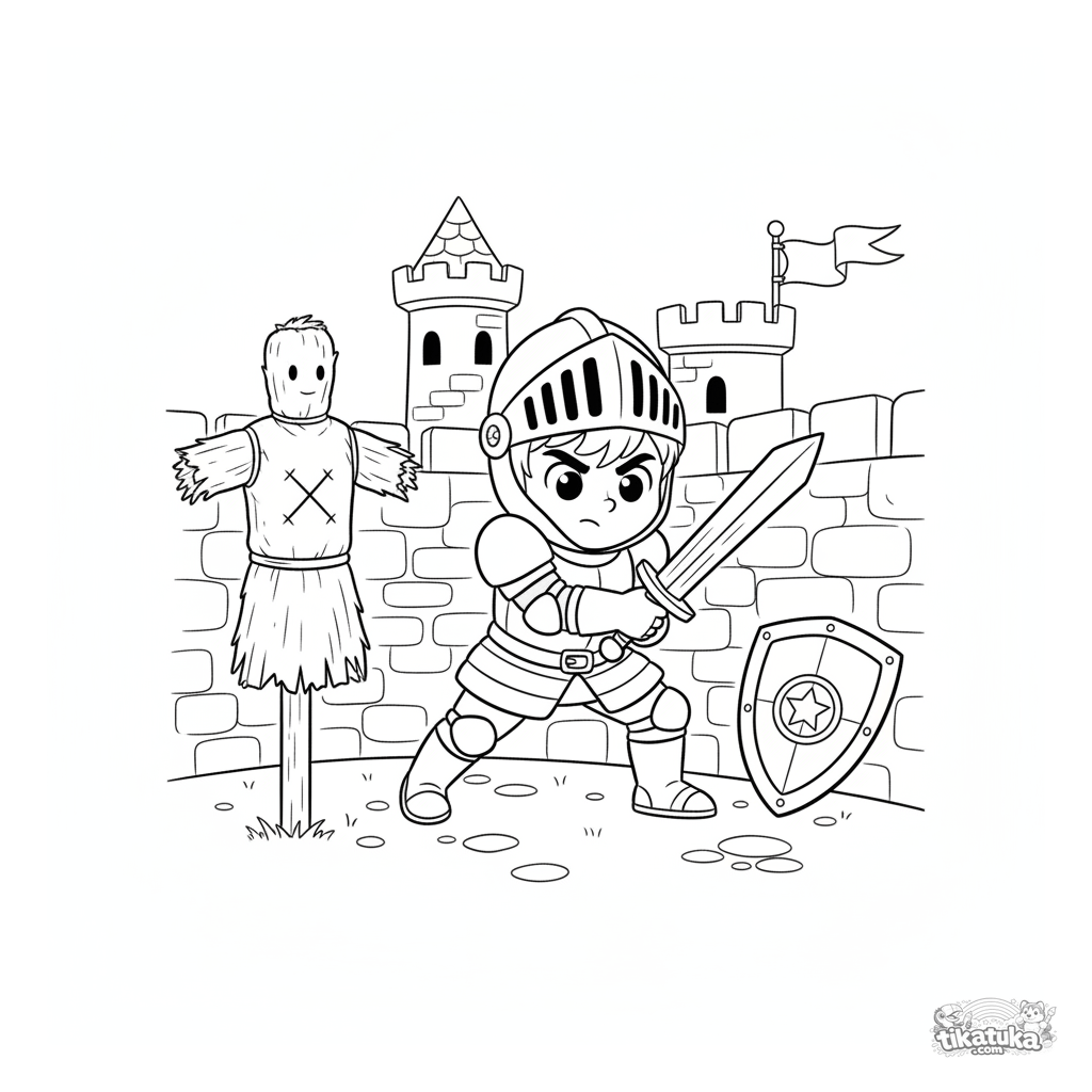 Ausmalbild für Jungen: Ein junger Ritter in Rüstung übt mit einem Holzschwert an einer Strohpuppe. Für 5-7 Jahre.