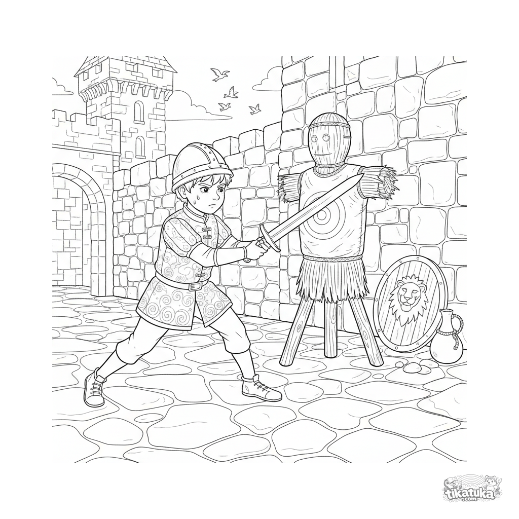 Ausmalbild für Kinder 6-9: Ein junger Ritter übt mit einem Holzschwert an einer Strohpuppe im Burghof. Eine detaillierte, realistische Szene.