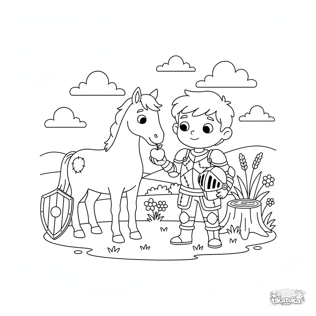 Ausmalbild für Kinder 4-6: ein freundlicher Ritter in lustiger Flickwerk-Rüstung füttert sein Pferd mit einem Apfel auf einer sonnigen Wiese. Eine Szene über Freundschaft.