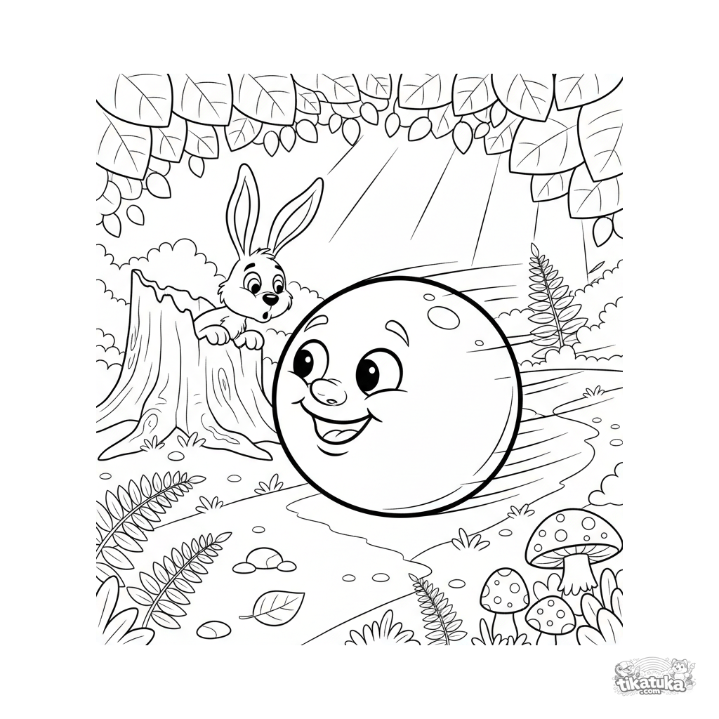 Ausmalbild für Kinder 4-6 aus einem russischen Märchen: Kolobok rollt fröhlich einen Waldweg hinunter und entkommt einem überraschten Hasen. Dynamische Szene.