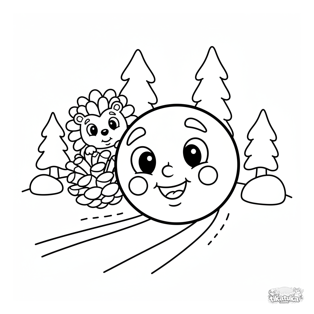 Ausmalbild für Kleinkinder von 2-3 Jahren: Kolobok aus dem russischen Märchen rollt fröhlich einen Waldpfad hinunter an einem Igel vorbei. Sehr einfache, große Formen.
