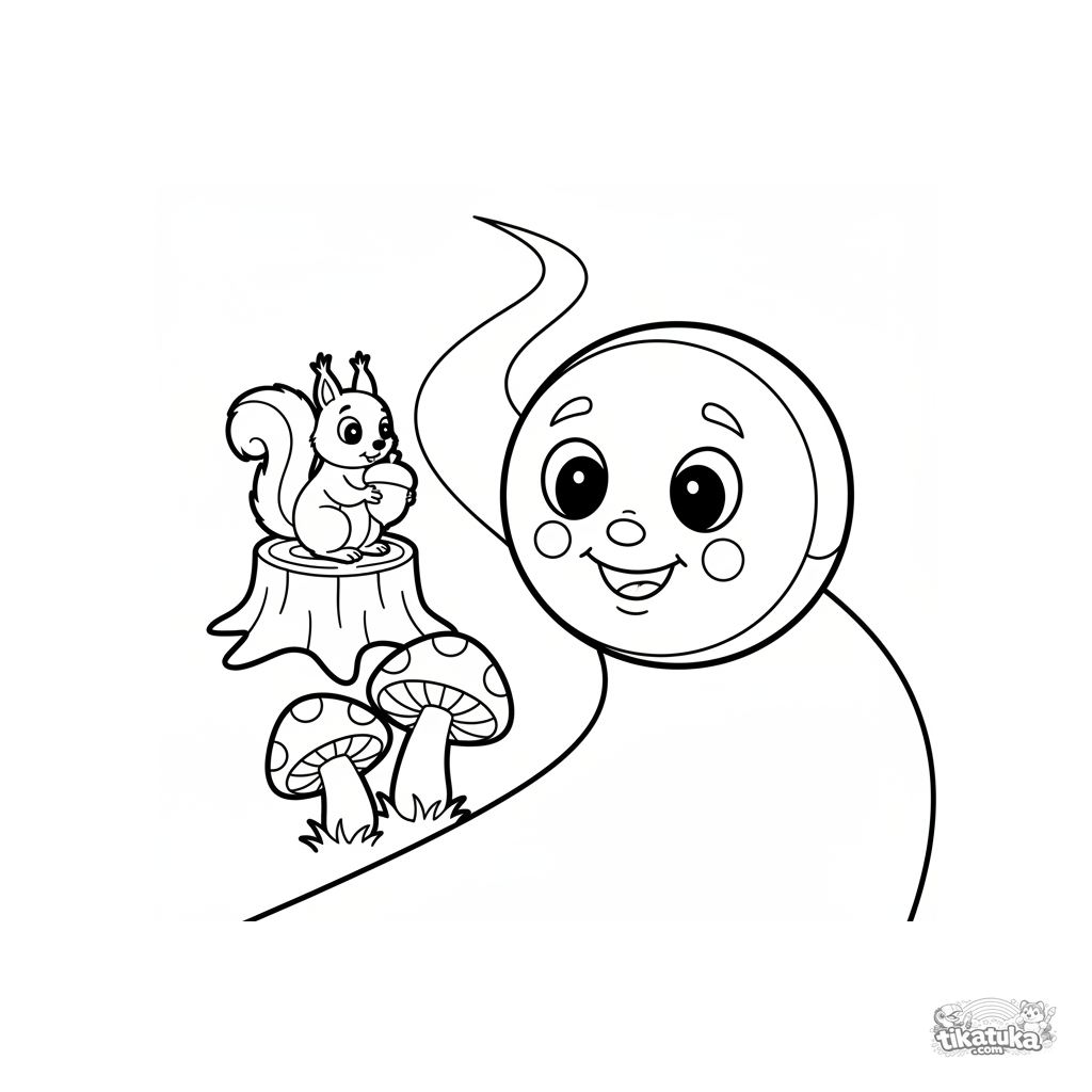 Kleinkind Ausmalbild 2-3 Jahre: Kolobok aus dem russischen Märchen rollt einen Waldpfad an einem Eichhörnchen vorbei. Sehr einfache, große Formen, dicke Umrisse.