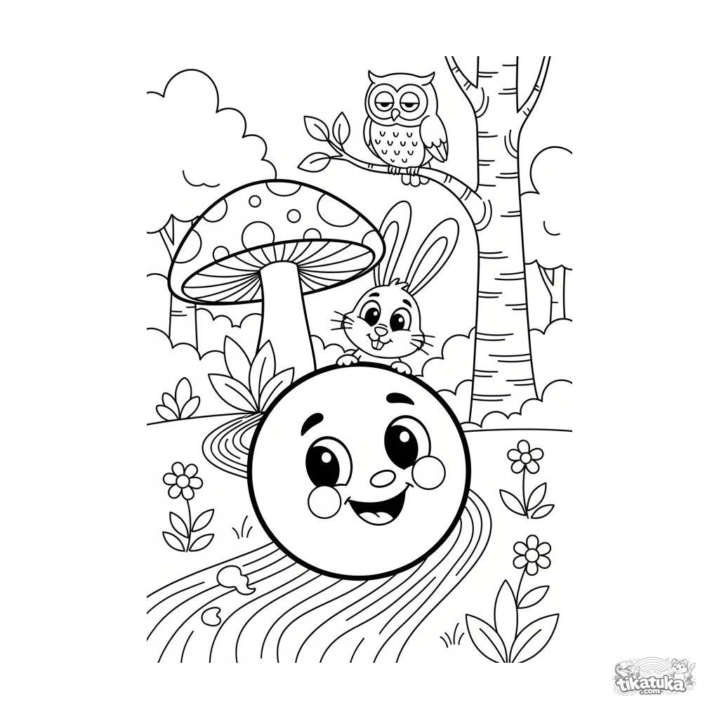Ausmalbild für Kinder 4-6 aus einem russischen Märchen: Der fröhliche Kolobok rollt einen Waldpfad hinunter, von Tieren beobachtet. Vertraute Szene.