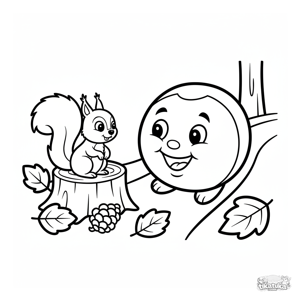 Kleinkind Ausmalbild 2-3: Kolobok rollt fröhlich einen Waldpfad hinunter und trifft ein Eichhörnchen. Sehr einfache Formen, große Details.