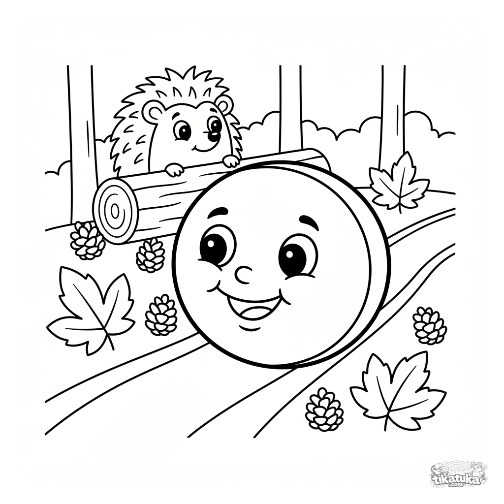 Kleinkind Ausmalbild 2-3: Der fröhliche Kolobok rollt einen gewundenen Waldpfad hinunter, vorbei an einem zuschauenden Igel. Sehr einfache, große Formen, perfekt für erste Buntstifte.