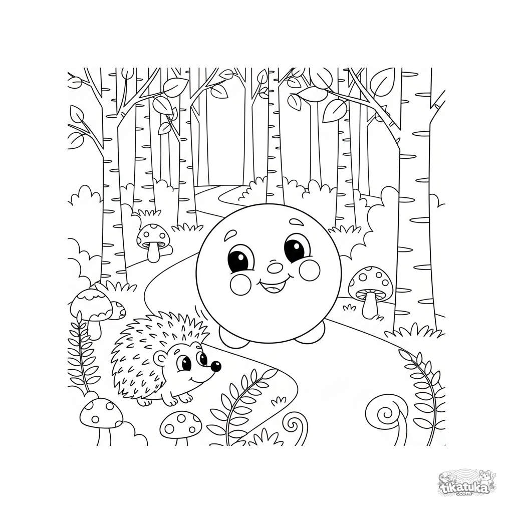 Ausmalbild aus dem russischen Märchen: Kolobok rollt fröhlich einen Waldweg entlang an einem Igel vorbei. Für Kinder von 4 bis 6 Jahren.