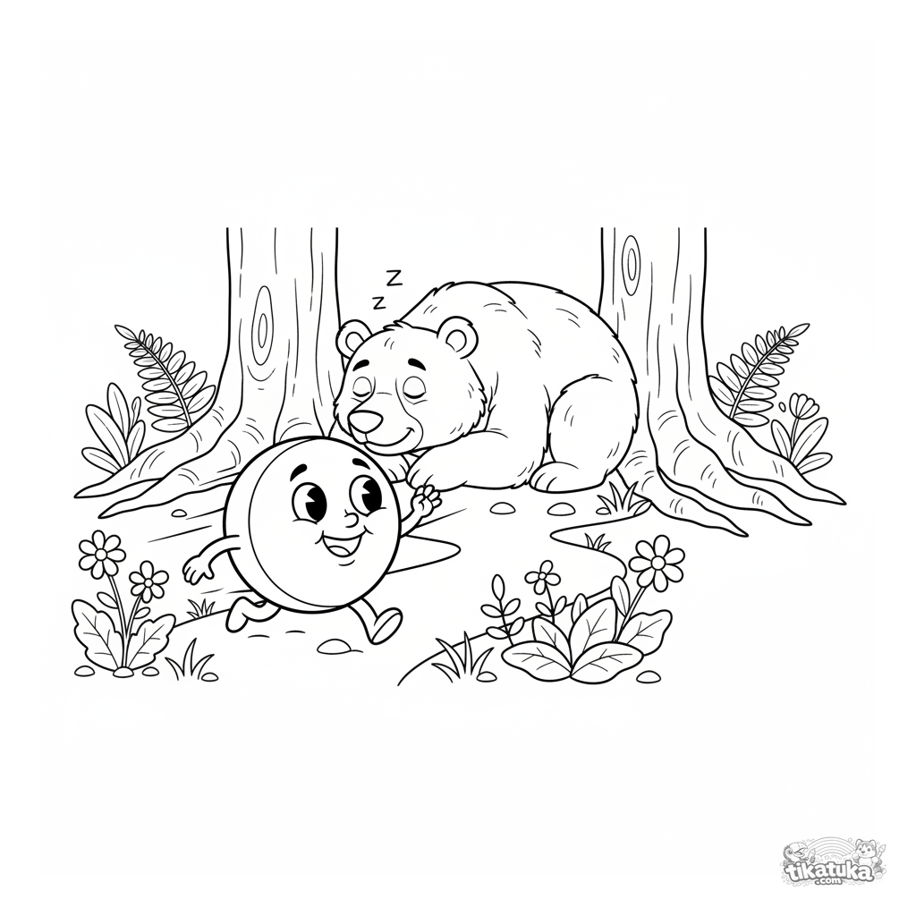 Ausmalbild für Kinder 4-6 aus einem russischen Märchen: Kolobok rollt durch den Wald an einem schlafenden Bären vorbei. Eine bekannte, lustige Szene.