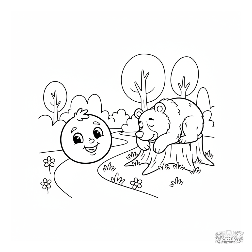Ausmalbild für Kinder 4-6 nach einem russischen Märchen: Kolobok rollt fröhlich an einem schlafenden Bären auf einem Waldpfad vorbei. Eine erkennbare Szene.