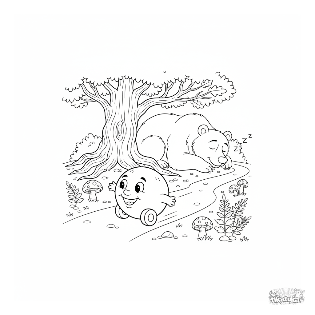 Ausmalbild aus einem russischen Märchen: Kolobok rollt an einem schlafenden Bären vorbei. Für Kinder 4-6 Jahre, erkennbare und lustige Szene.