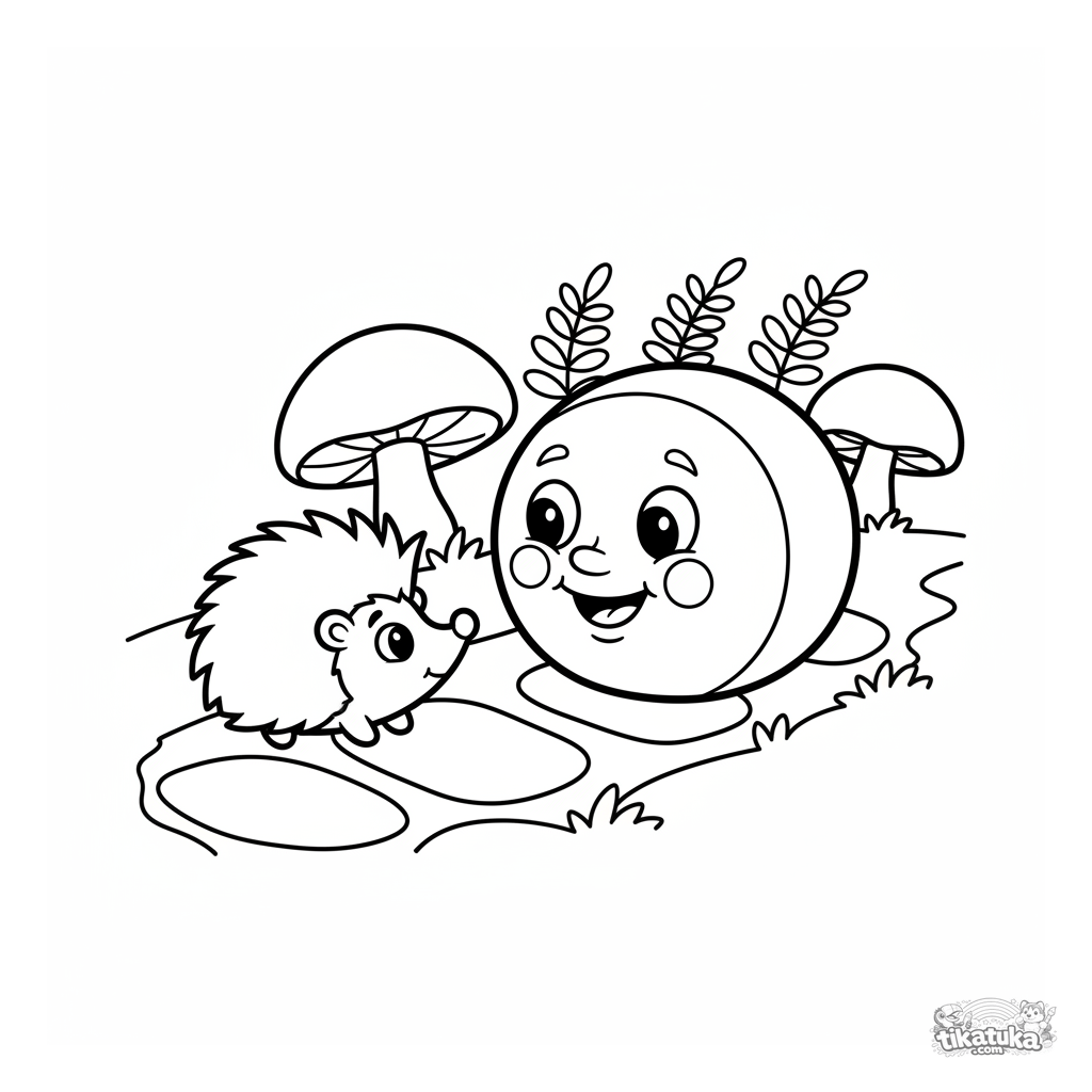 Kleinkind Ausmalbild 2-3: Der fröhliche Kolobok aus dem Märchen rollt an einem neugierigen Igel auf einem Waldweg vorbei. Einfache Formen.