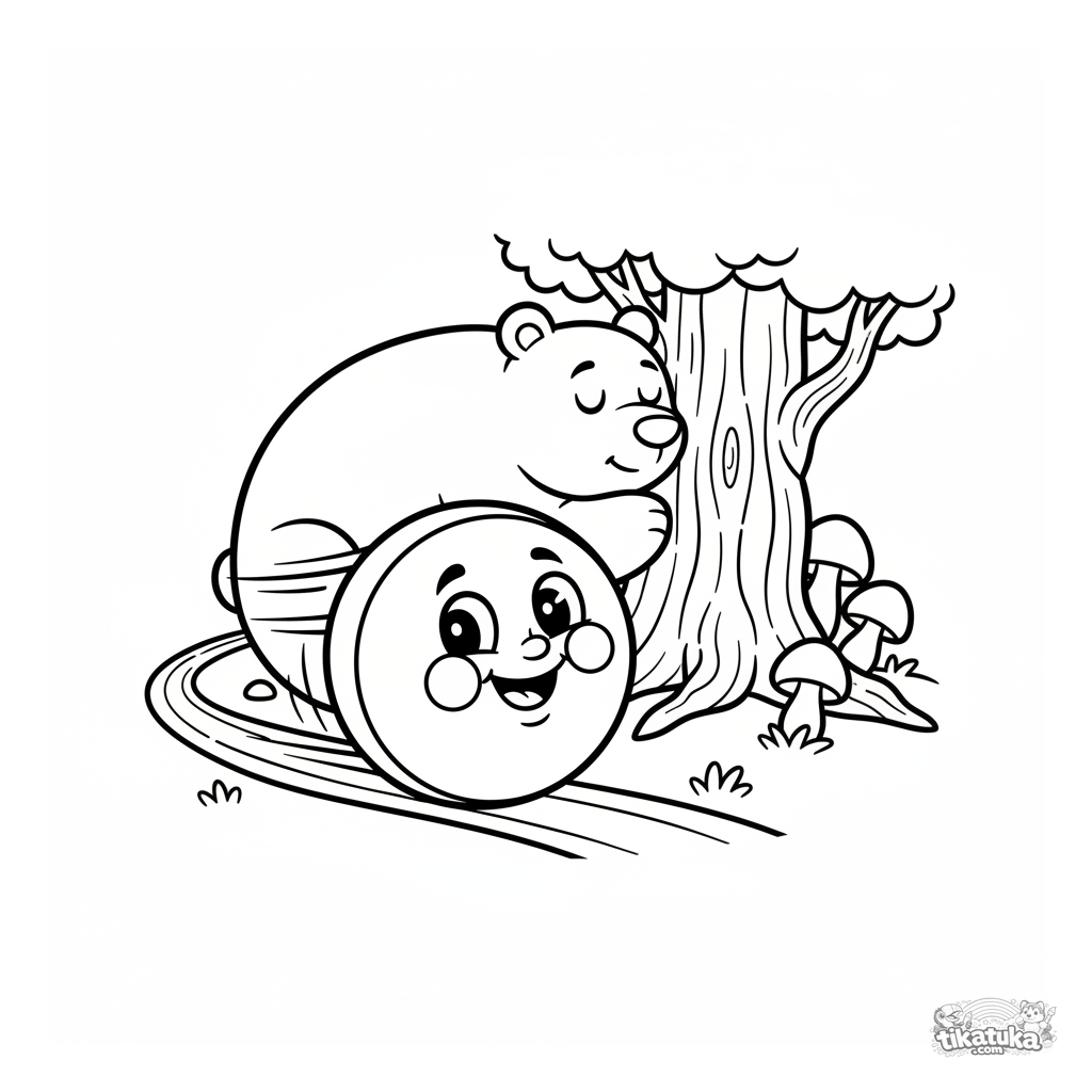 Einfaches Ausmalbild aus einem russischen Märchen: Kolobok rollt an einem schlafenden Bären vorbei. Große Formen, wenige Details.