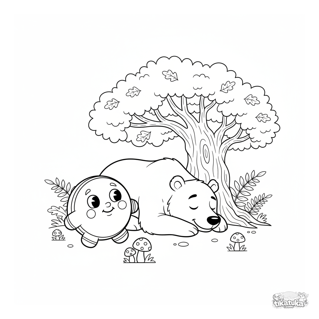 Ausmalbild aus einem russischen Märchen für Kinder 4-6: Kolobok, das Lebkuchenmännchen, rollt vorsichtig an einem schlafenden Bären vorbei. Eine bekannte Volksmärchenszene.