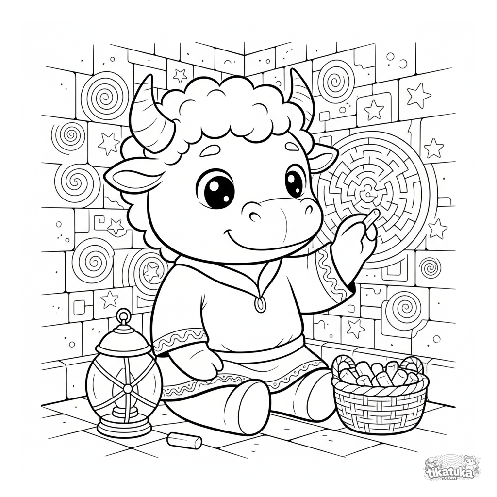 Ausmalbild für Kinder 7-12: Ein freundlicher Minotaurus-Künstler zeichnet mit Kreide an den Wänden einer riesigen Labyrinth-Halle. Detaillierte Comic-Abenteuer-Szene.