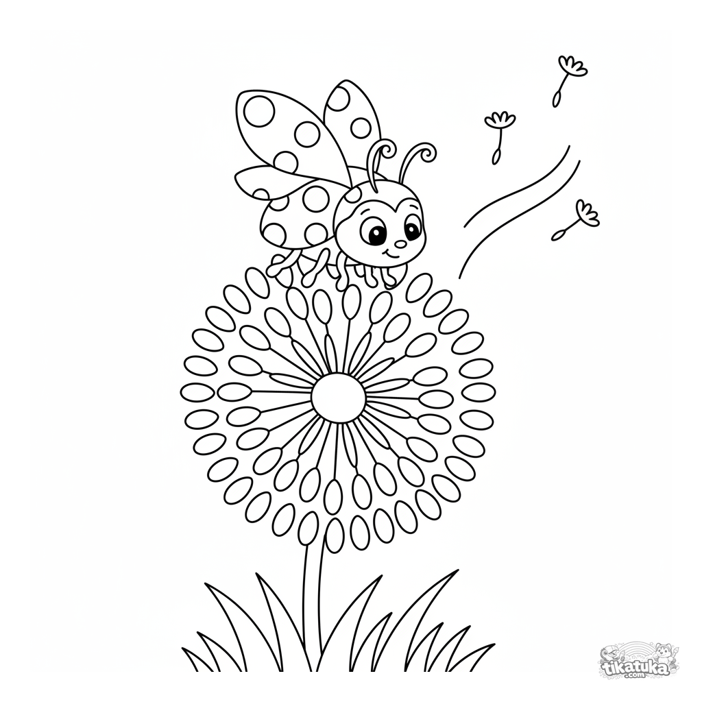Einfaches Ausmalbild für Kleinkinder von 2-3 Jahren mit einem Marienkäfer. Große, klare Formen zeigen das Insekt auf einer Pusteblume.